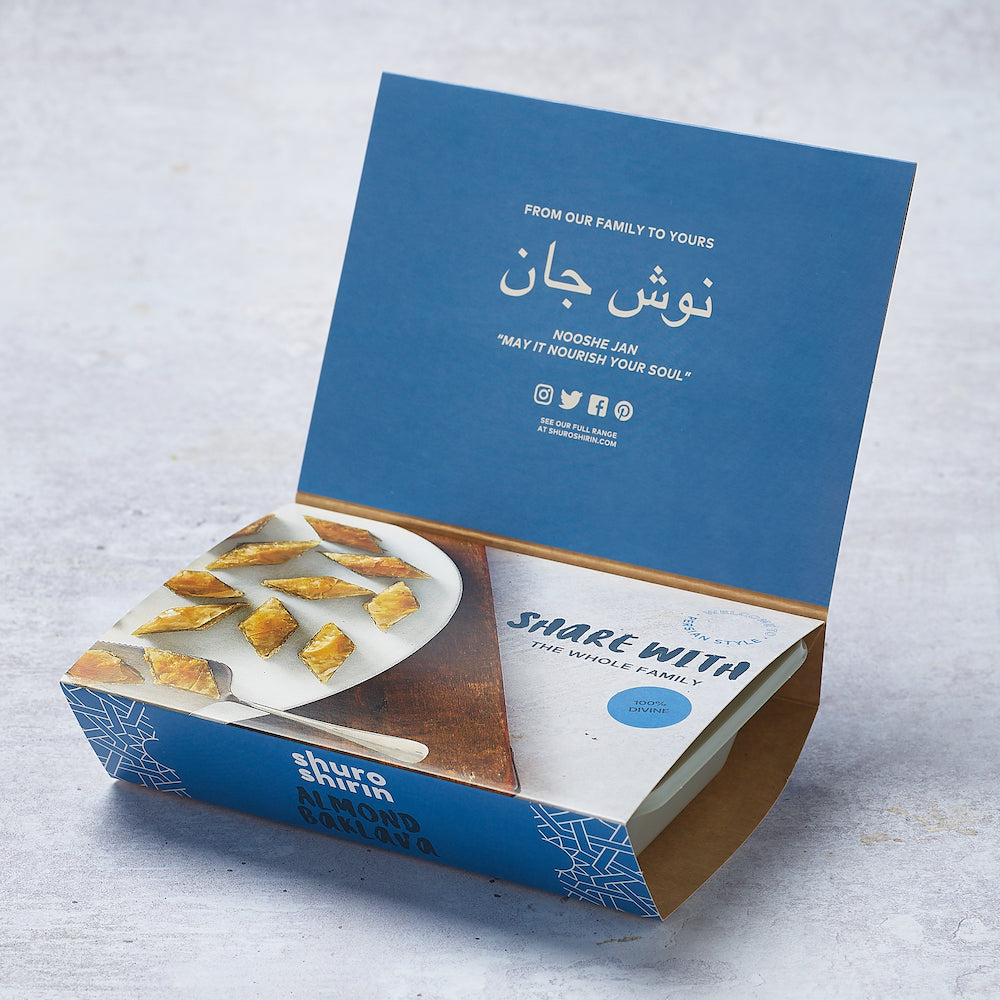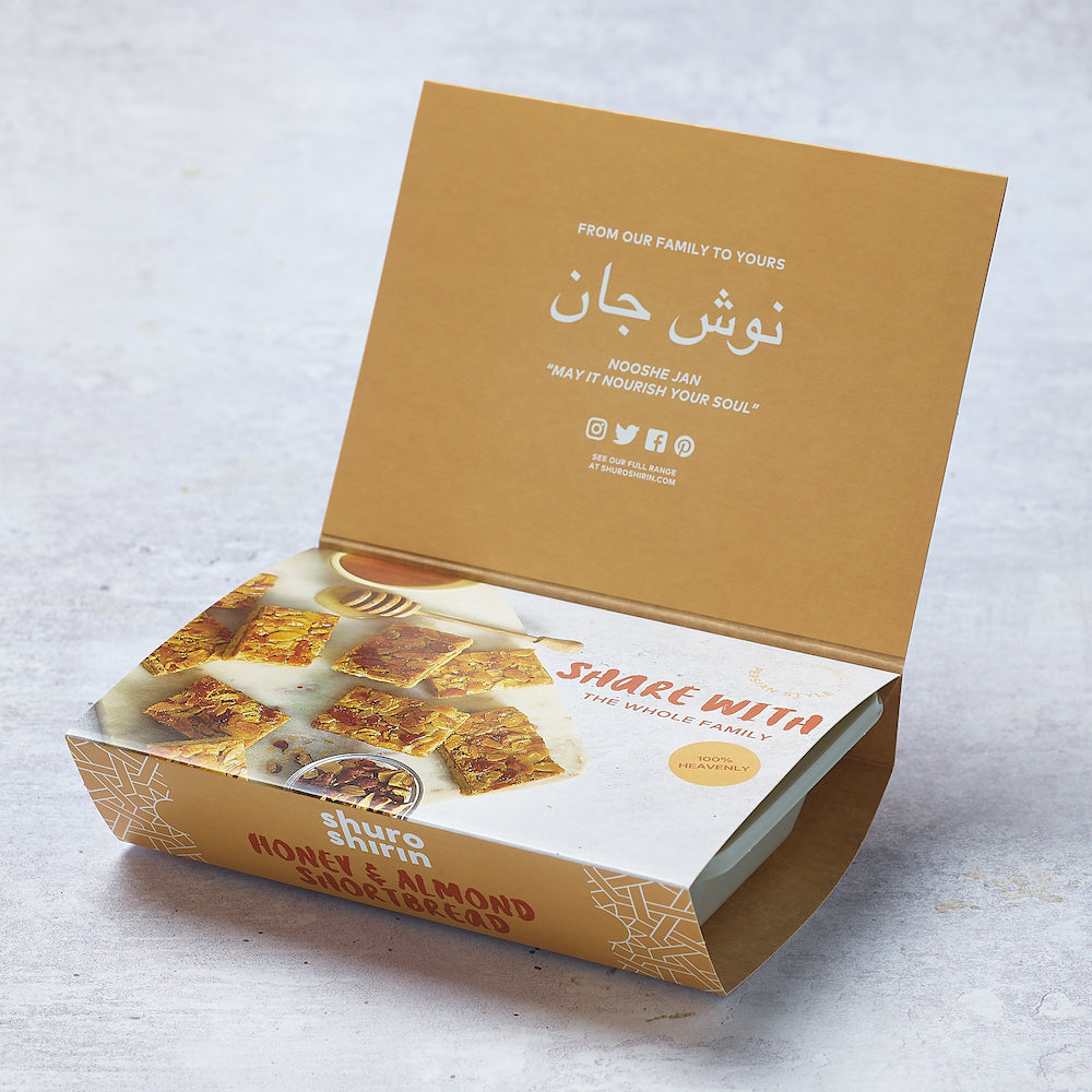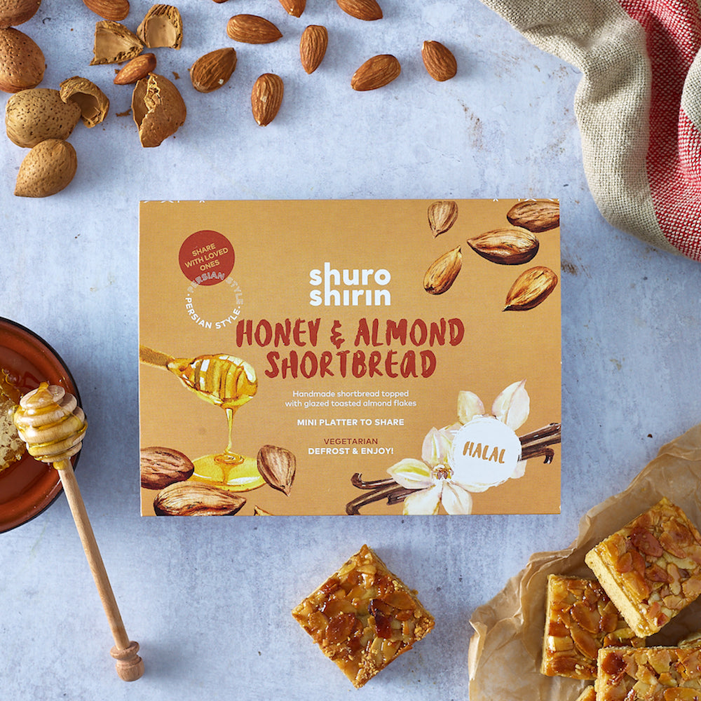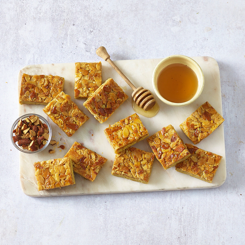 A rich, handmade shortbread topped with honey glazed almond flakes.